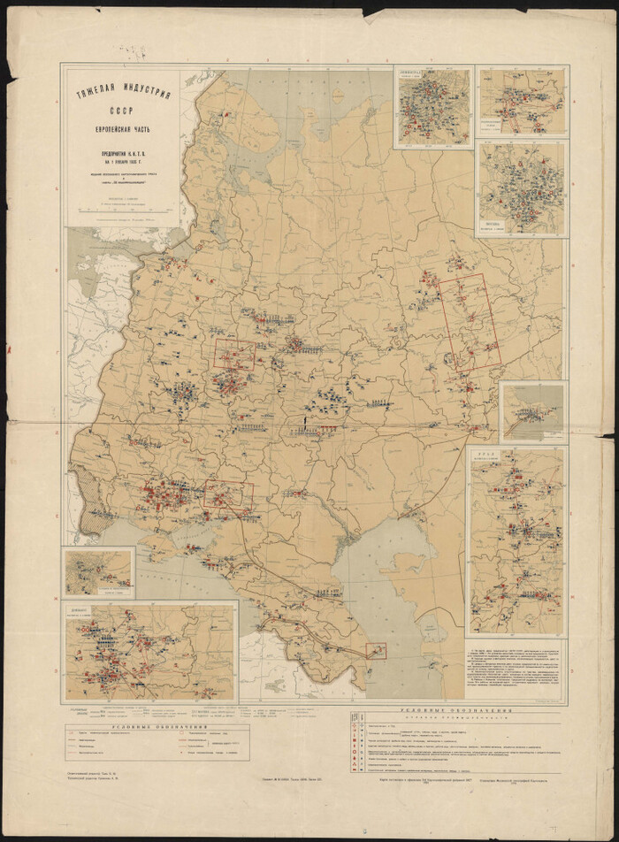 Тяжелая индустрия СССР / Составлена и оформлена 2-й Картографической фабрикой ВКТ; Отв. ред. Таль Б. М. — Москва: Всесоюзный картографический трест, Газета "За индустриализацию", 1934. — 2 к. (2 л.)
