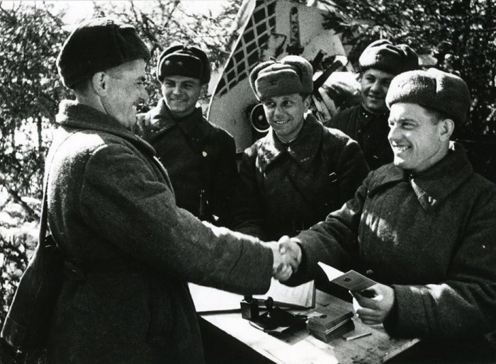 Северо-Западный фронт. Старший политрук Д. Т. Сорокин вручает комсомольский билет гвардейцу-наводчику В. С. Лодутько. Фото - Сергей Коршунов, 1942 год