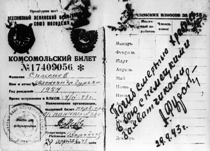 Юра Жданко, сын полка, в 11 лет — досрочно, редчайший случай, принят в Комсомол, комсомольский билет № 17445064 выдан в декабре 1942 г.