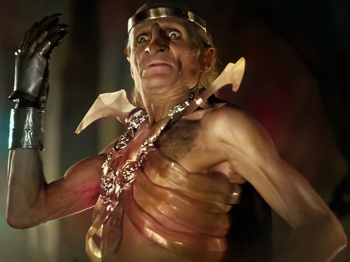 Командир фракийских наемников -- Слут, в одной набедренной повязке и с мечом в руке подошел к самке-матриарху, и разрубил ей половину уха. Слониха разъяренно заревела