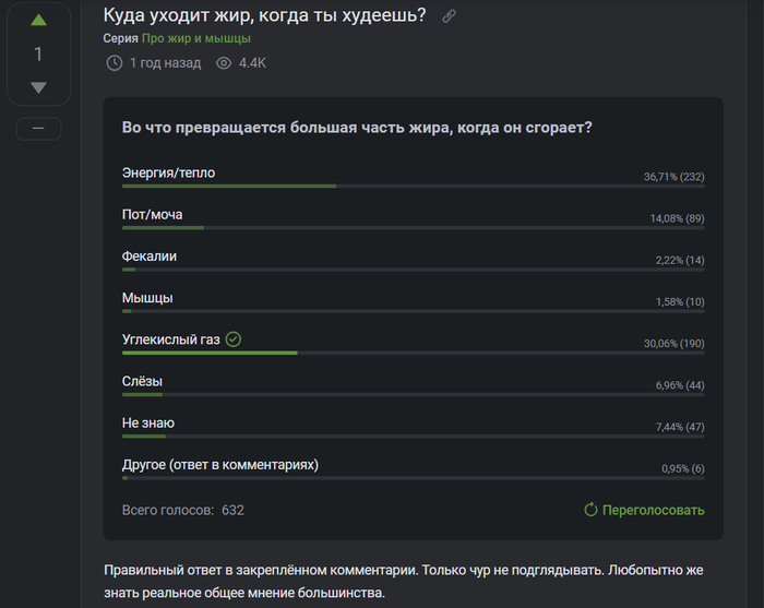 В 2014 году учёные провели опрос, который показал, что люди плохо понимают, что происходит с жиром во время похудения. Прикол в том, что они опрашивали только тех, кто должен в это разбираться по своей работе. Среди 150 респондентов были только врачи, диетологи и тренеры. Вопрос звучал: "Когда человек теряет вес, куда он уходит?"