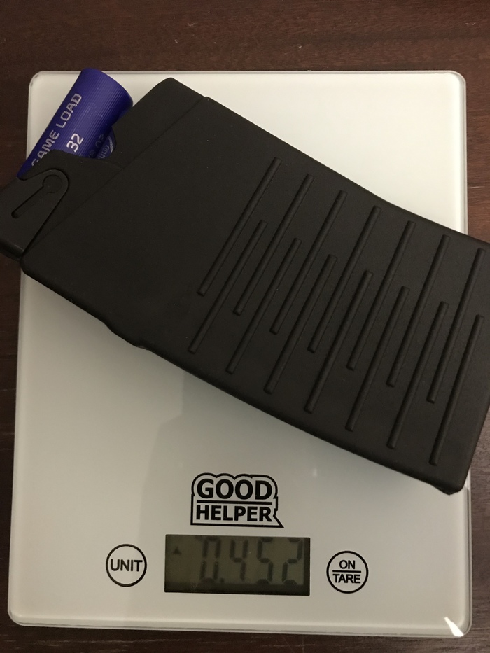 Кстати, ещё раз вернусь к весу карабина. На фото сверху он без магазина. Вот фотографии сколько весит полностью снаряженный магазин на 8 патронов и магазин на 5 патронов. Патроны Рио 32 гр. дробь 3 номер. Понятно, что в зависимости от патронов вес будет меняться, но для наглядности зарядил тройкой.