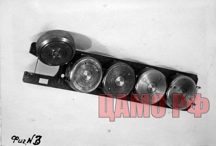Для сообщения скорости гранате служит вращающийся диск с ведущим каналом (фиг №2), гранаты весом 500 грамм каждая заключаются в обоймы по 5 штук (фиг №3), которые могут подаваться непрерывно одна за другой.