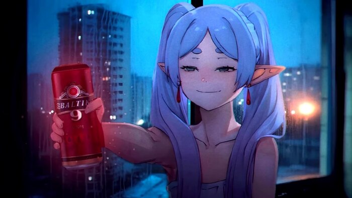 Объясню почему. Ниже представлено оригинальное изображение. И тут она сидить в сумеках, под светом многоэтажек спального района. От того и цвет волос отливает синевой. Ну а банка пива, это банка пива)
