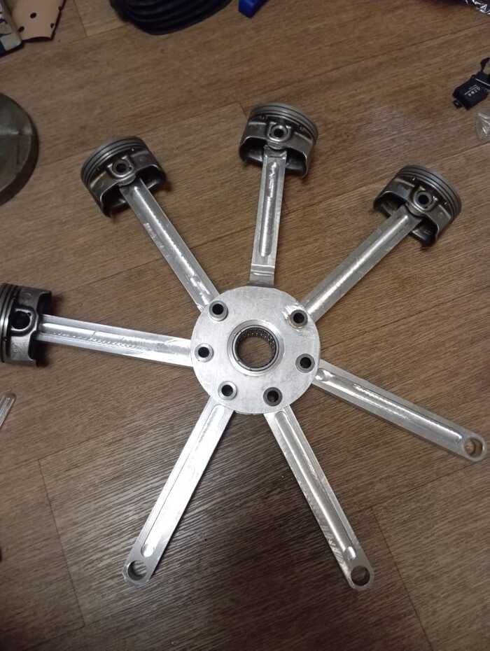 Теперь их нужное количество.Притащил домой два цилиндра,колено,шатуны,поршня,чтобы прикинуть как оно собирается,где цепляется,как вращается.Но вроде все нормально.