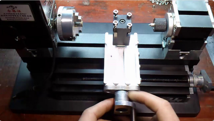 Работает об бесщоточного двигателя 12 вольт, через ременную передачу. Максимальная длина заготовки, которую можно установить для обработки 130 мм — длина, диаметр — 100 мм.