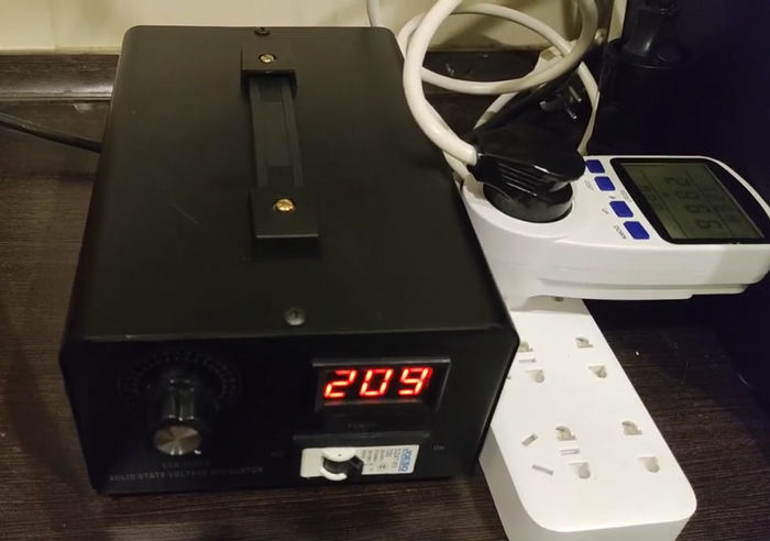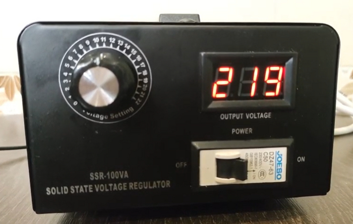 Устройство выдерживает пиковую нагрузку до 10 кВт, на передней панели имеется цифровой дисплей, на который выводятся результаты установленного напряжения на выходе прибора.