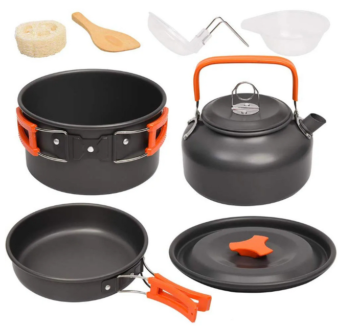 Этот комплект посуды для кемпинга включает в себя кастрюлю с крышкой, сковороду, чайник, половник, лопатку, мочалку и три глубокие тарелки.