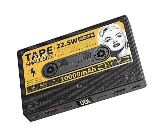 Еще один крутой девайс — power bank в корпусе плёночной кассеты. С ёмкостью 10000 мАч, он может зарядить два телефона и сам заряжается за 3 часа. Этот стильный внешний аккумулятор выполнен в ретро-дизайне, напоминая старые плёночные кассеты, что делает его не только функциональным, но и оригинальным аксессуаром.