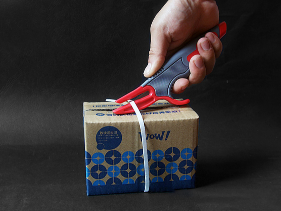 Двухсторонний нож с выдвижным канцелярским лезвием на одной стороне рукояти и ножом для распаковки коробок, а также раскройки пленки картона, бумаги и других материалов на другой.