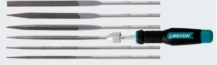 В комплекте имеется 6 надфилей разных форм и профилей (квадратный, круглый, плоский, полукруглый, треугольный, тупоносые и остроносые), что позволит обрабатывать нужную поверхность на любом изделии.