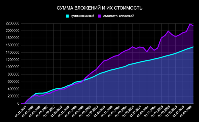 В мой портфель входят 4 брокера (Т-Инвестиции, А-Инвестиции, СберИнвестиции и БКС) и по состоянию на 1 сентября 2025, сумма на всех счетах составляла 2 184 000 ₽.