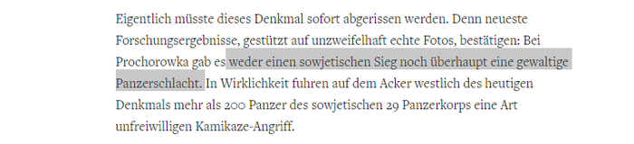 Да, "вообще-то, этот памятник должен бы быть немедленно снесён. Свежайшие исследования, опирающиеся на неоспоримые настоящие фотографии подтверждают: в Прохоровне не было ни советской победы, ни вообще большого танкового сражения. На самом деле на поле с запада от сегодняшнего памятника больше 200 советских танков 29 танковой бригады провели недобровольную камикадзе-атаку" (я вот в ахуе, а они там все с другой стороны добровольно атаку проводили и евреев получается тоже добровольно... хотя о чём это я...)
