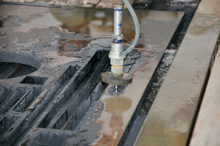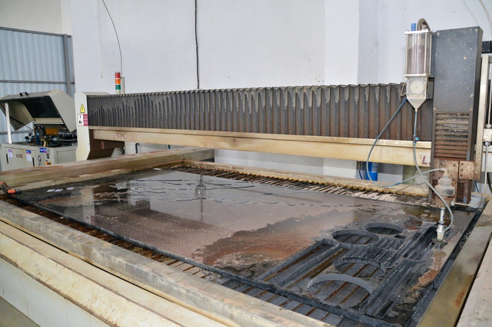 На станке гидроабразивной резки изготавливают из огромной пластиковой или алюминиевой пластины отдельные комплектующие для конвейера. Резка в этом случае происходит с помощью воды с абразивами, выглядит процесс довольно интересно.