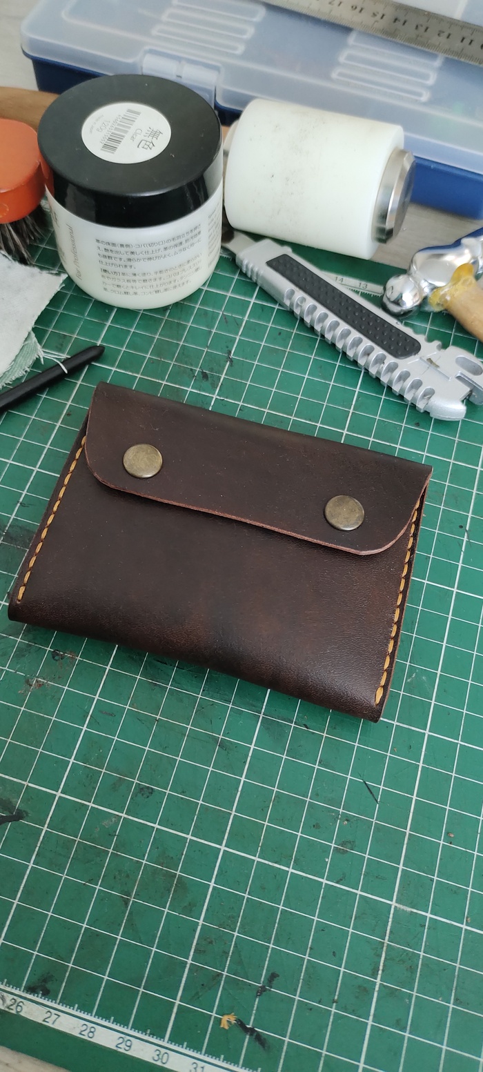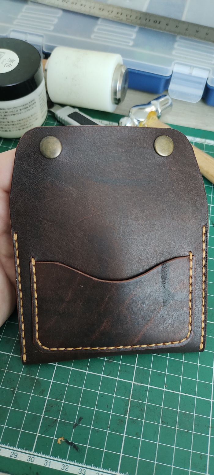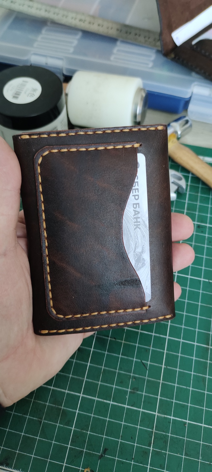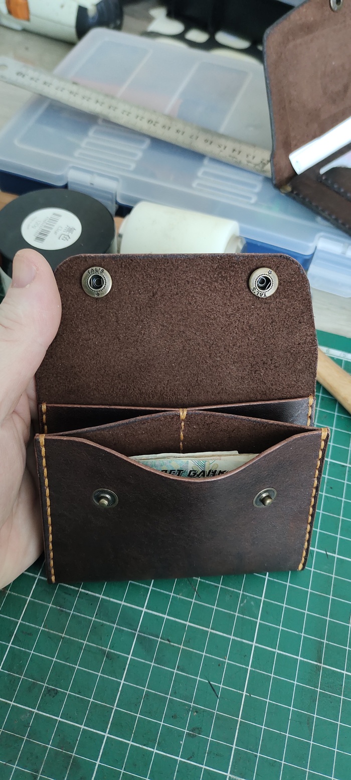 После работы, я садился дома за стол, ковырялся с кусками кожи, долбил молотком и получал немыслимое удовольствие (простите соседи). Учился резать, шить, полировать торцы. Через какое-то время, думаю дня 4, в моих руках родился первый кошелек. Кривой, не без косяков, но свой. Кстати, я до сих пор с ним хожу, спустя 3 года— оказался неубиваемый.