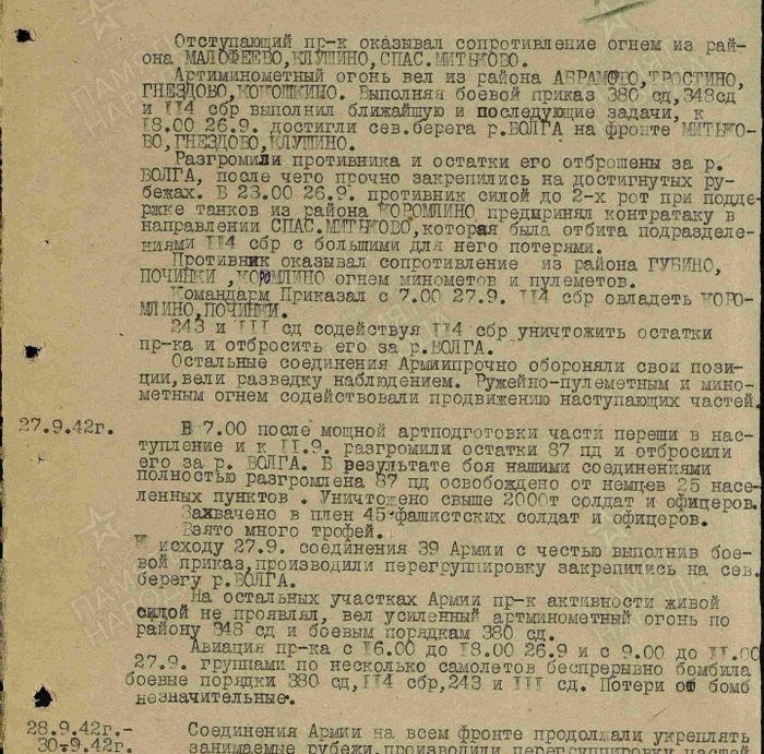 В общем, враг дрогнул и начал отход на Старое Коростелево и Спас-Митьково, на других участках немцы еще удержались какое-то время. Тем не менее советские войска устремились к Волге, берегов которой достигли уже вечером первого дня наступления у населённых пунктов Митьково-Гнездово-Клушино (380-я, 348-я сд и 111-я сбр). Однако потеряв часть плацдарма, немцы решили контратаковать и восстановить положение. В районе Спас-Митьково в наступление перешли две роты при поддержке бронетехники, но атака была отбита, а плацдарм продолжал скукоживаться, и утром 27 сентября 1942 года перестал существовать как таковой. Потери врага наши оценили в 2 тысячи человек, собственные составили порядка 700.Кстати я рассказывал про штурмовку, в которой Ил-2, помогли вражеские истребители, поднятые по тревоги. А у меня все. Еще больше фактов на канале "Наша история это Гордость" в ТГ. Спасибо за внимание. До свидания!