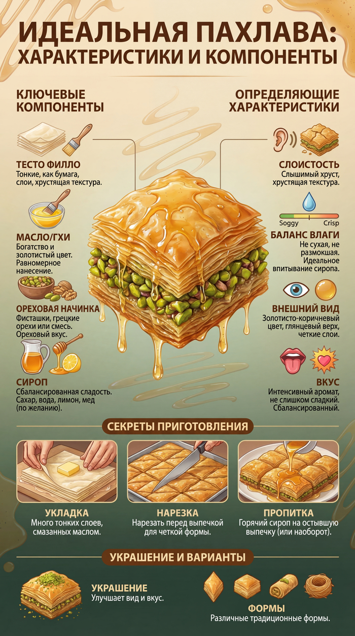 Создай образовательную кулинарную инфографику под названием "Идеальная пахлава: характеристики и компоненты". В центре - большой, идеально нарезанный кубик турецкой пахлавы, показанный в трехмерном изометрическом виде, с множеством тонких слоев фило, ярко-зеленой фисташковой начинкой в середине и густым золотистым сиропом, стекающим по краям и накапливающимся под ним. Теплая медово-золотистая цветовая гамма. Вокруг центральной части пахлавы разместите маленькие иллюстрированные значки и короткие надписи, обозначающие: тесто для фило, масло/гхи, ореховую начинку (фисташки, грецкие орехи), сироп, слоистость, баланс влаги, внешний вид и вкус. Внизу разместите раздел с тремя небольшими панелями, демонстрирующими секреты приготовления: укладка слоями, нарезка и приготовление сиропа, а также последний ряд для украшения и приготовления пахлавы различной формы. Плоский, но слегка трехмерный векторный стиль, чистая типографика, высокое разрешение, светло-бежевый фон с тонкими завитками сиропа, современный дизайн постера с едой.
