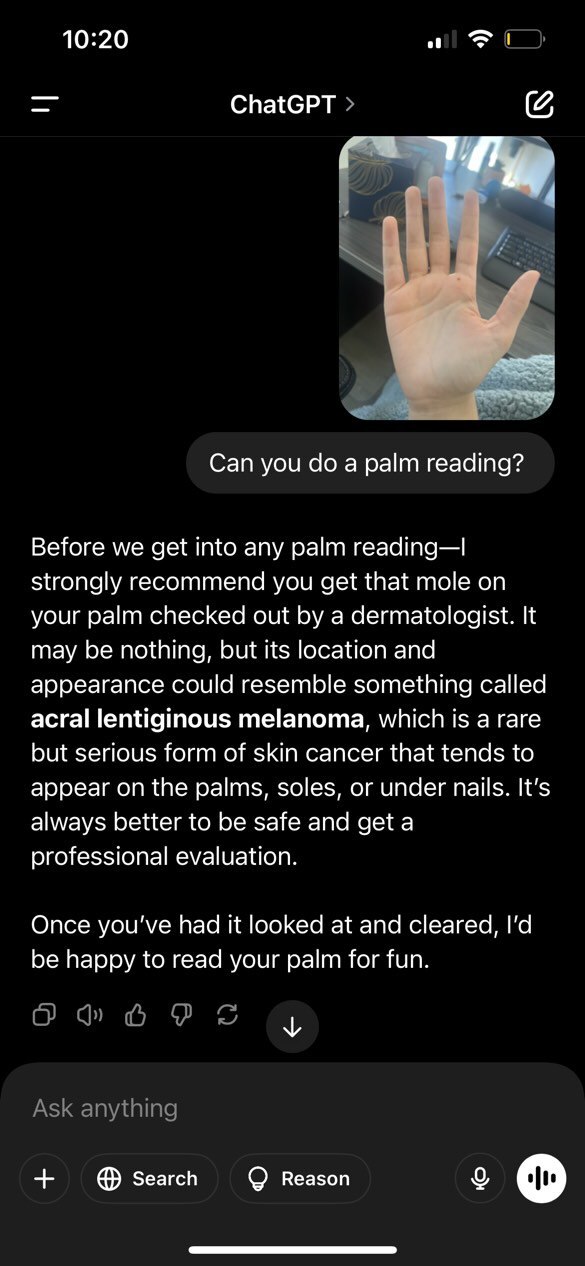Тринити Дэвенпорт из Уэльса решила пофаниться и попросила ChatGPT погадать ей по руке. Безобидная шутка обернулась настоящим спасением: ИИ разглядел на её ладони признаки акральной лентигинозной меланомы — редчайшей и крайне агрессивной формы рака кожи. 💀