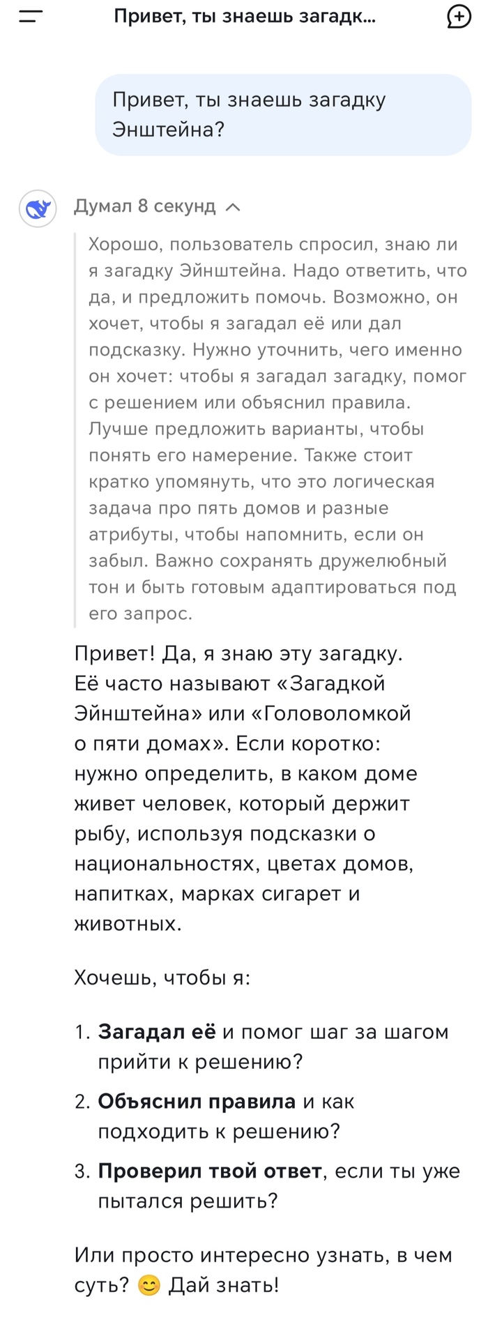 Там очень длинный скрин, поэтому сама суть. DeepSeek с рассуждениями и пояснениями озвучил саму загадку, спросил нужна ли помощь в ее решении и пошагово расписал решение. Особенно понравилось что ИИ не умея рисовать, нарисовал табличку знаками и оперировал ей.