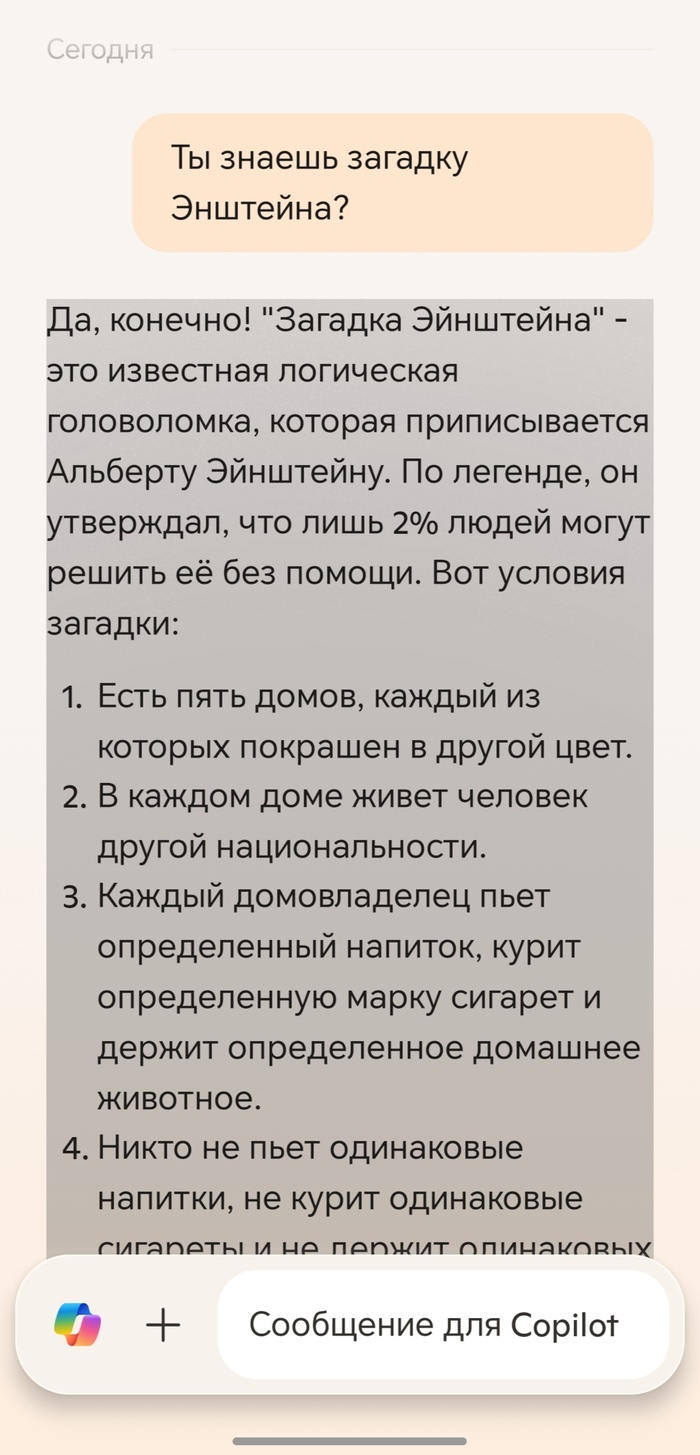Следующая на очереди была Copilot. Почти все тоже самое, только без рассуждений. Он сразу расписал условия и саму загадку. Копилот рисовать умеет, поэтому таблички он красивые нарисовал.