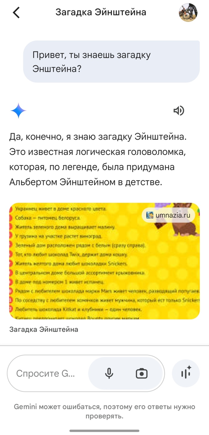 И финалочка гугловская нейронка Gemini которая просто по умолчанию появилась в телефоне. Понравилось то что Гемини вставляет ссылки на источники. Но общение с ним началось и окончилось одним вопросом.