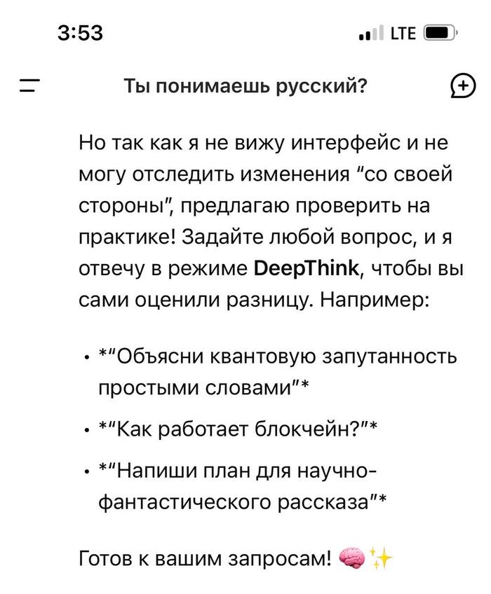 Зато у DeepSeek есть функция, которой нет у более дорогих западных моделей — DeepThink. Если активировать её, бот перед выдачей ответа будет показывать процесс своих «рассуждений». Выглядит это одновременно впечатляюще и немного жутко. Пока не вполне ясно, как это использовать. Разве что можно лучше понять «мышление» модели и корректировать запросы в соответствии с этим. В остальном пока кажется забавной игрушкой, но не более.