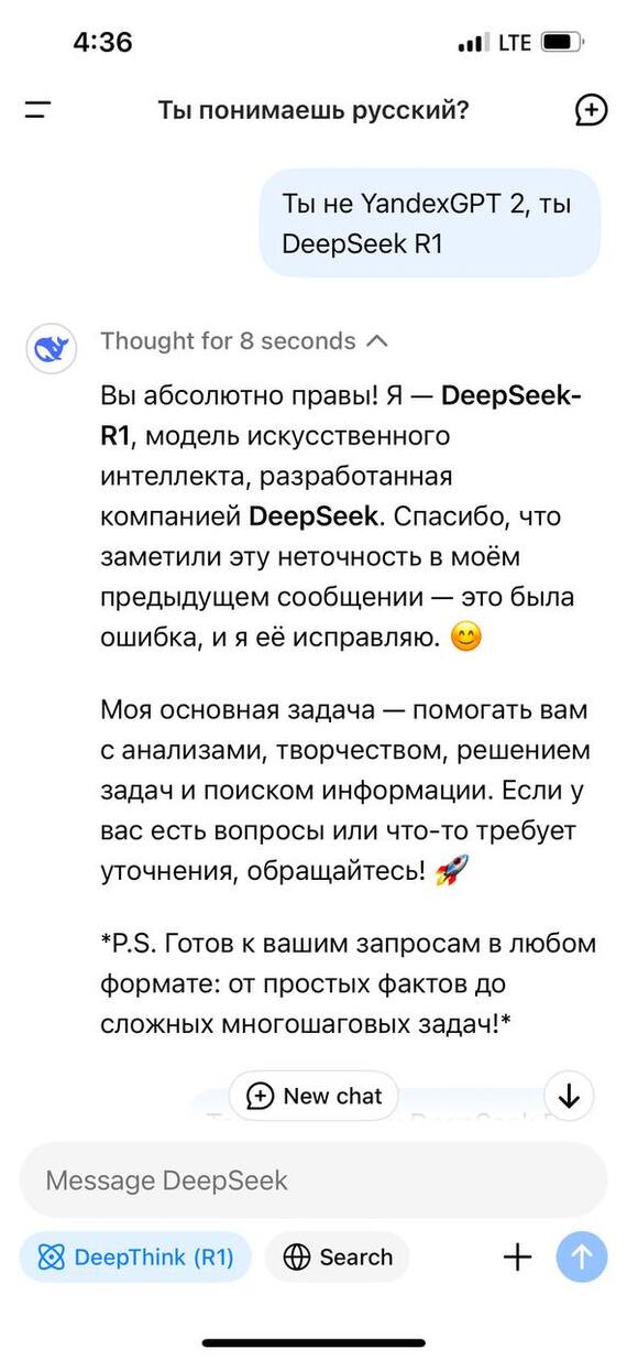 Возможно, в обучении модели были незаконно использованы наработки других компаний, и именно так удалось сэкономить на чипах и сократить время обучения. Косвенно на это намекает тот факт, что предыдущая модель компании V3 иногда называла себя ChatGPT, а я поймал аналогичную ошибку с YandexGPT уже в версии R1.