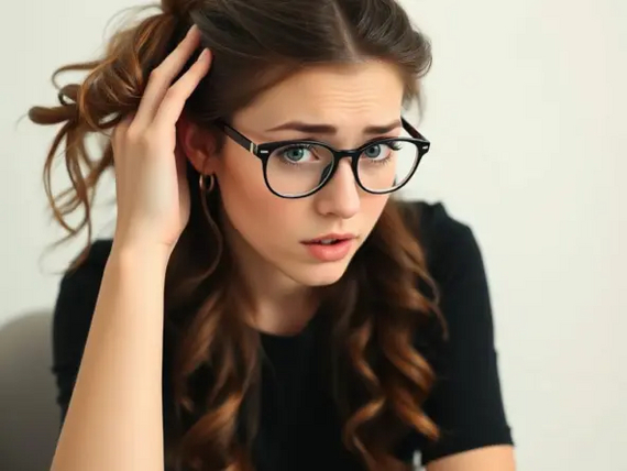 with an expressive face, sitting with hand holding head in shock or despair. She has wide eyes and a slightly open mouth to convey surprise or worry