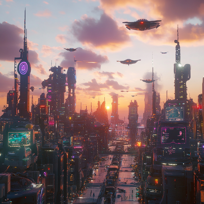 Промпт: A futuristic city skyline at sunset, filled with flying cars and neon lights.