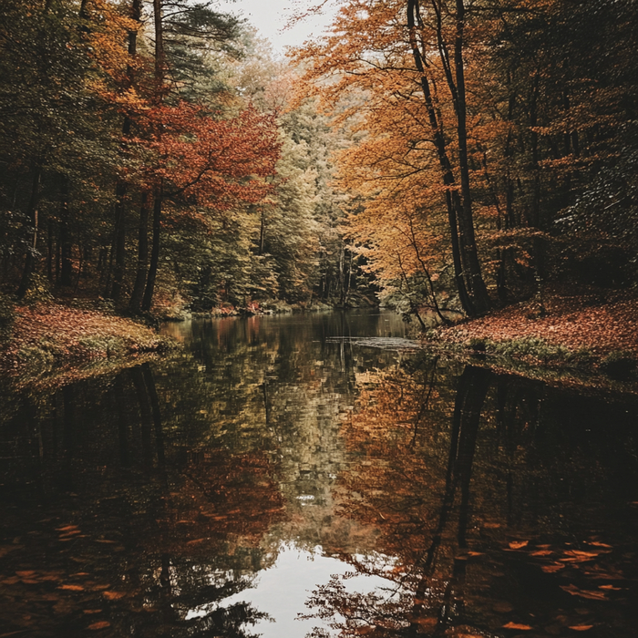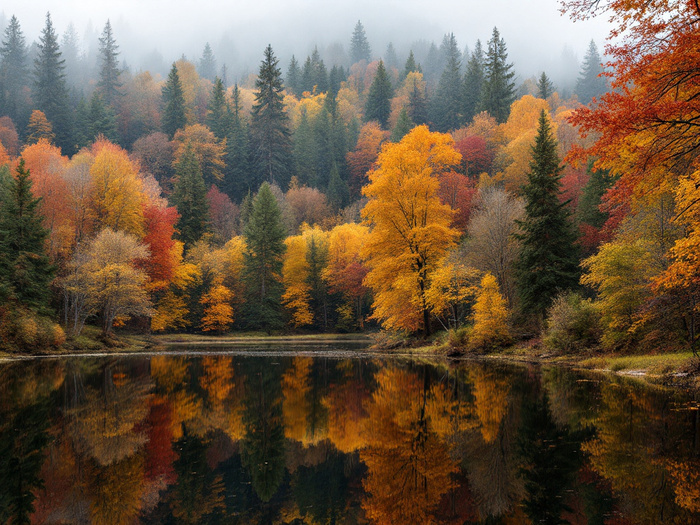 Промпт: A serene forest scene with a tranquil lake reflecting the autumn foliage.