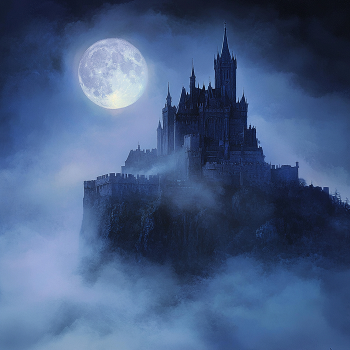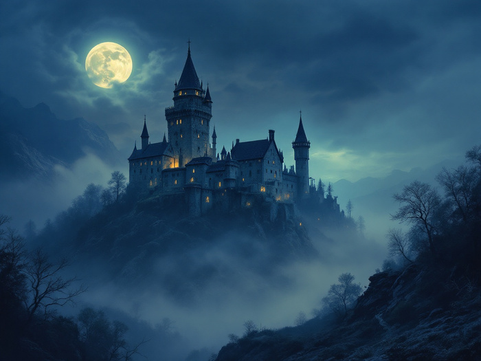 Промпт: An ancient castle on a hill, surrounded by mist and glowing under a full moon.