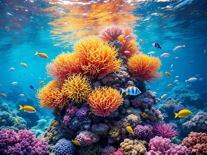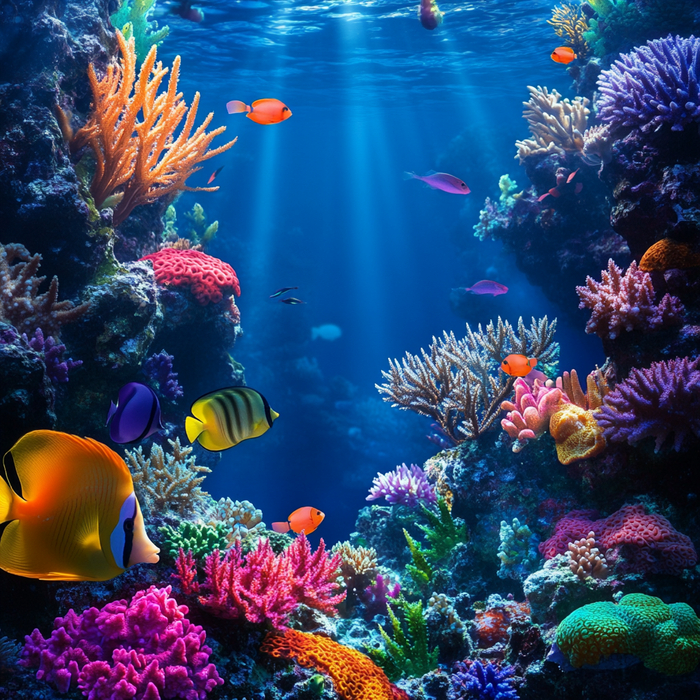 Промпт: A vibrant underwater world, teeming with colorful coral reefs and exotic fish.