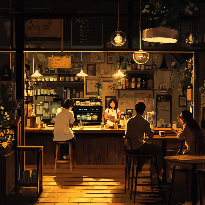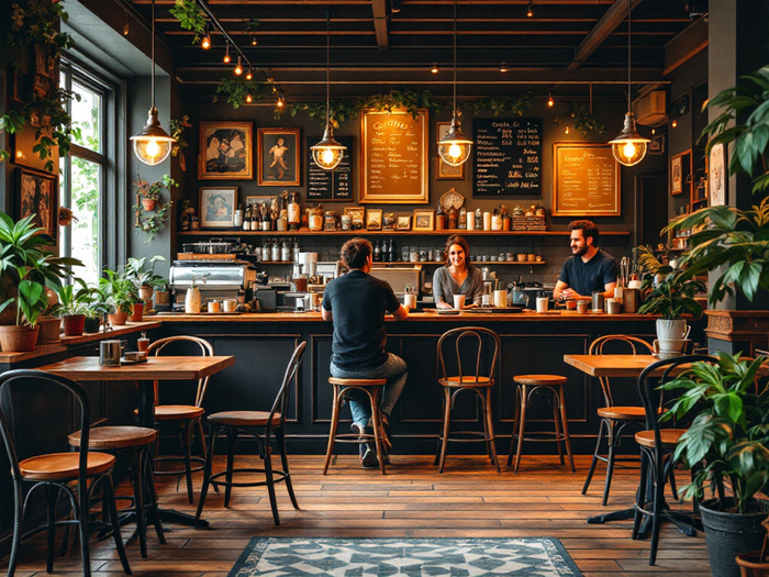 Промпт: A cozy coffee shop interior, featuring warm lighting, vintage furniture, and happy customers.
