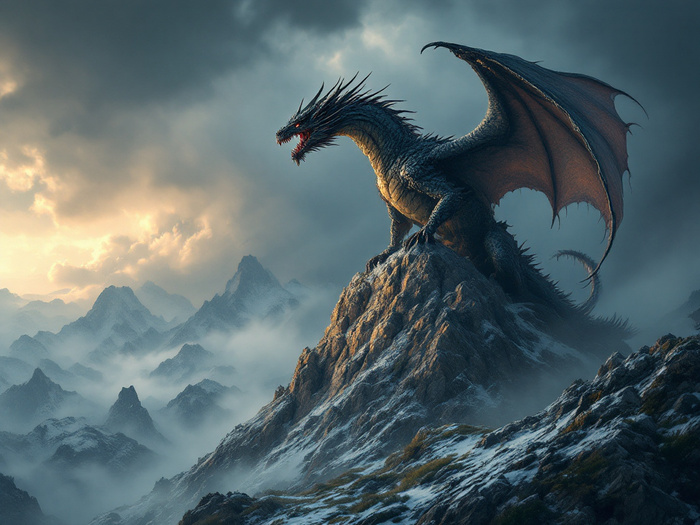 Промпт: A fierce dragon perched atop a mountain peak, with storm clouds gathering around.