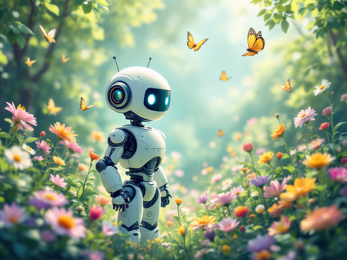 Промпт: A cute robot exploring a lush garden filled with flowers and butterflies.