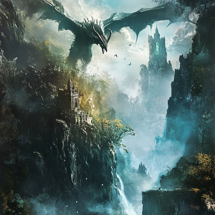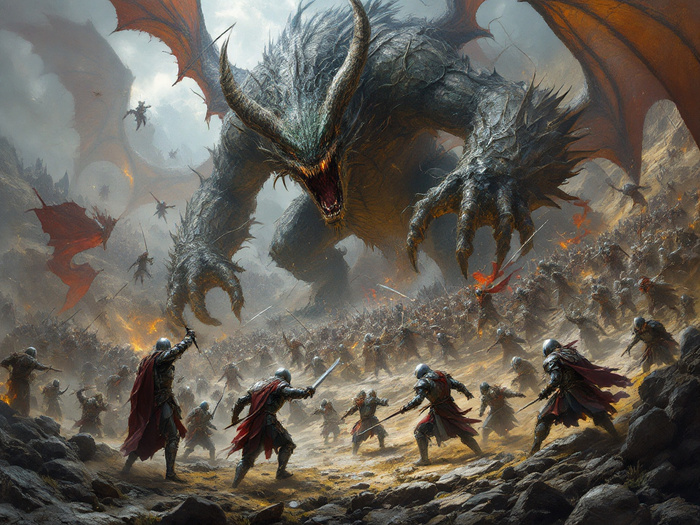 Промпт: An epic battle scene between knights and mythical creatures in a medieval setting.