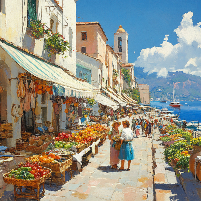 Промпт: A busy market street in a small Mediterranean town, bustling with vendors and tourists.