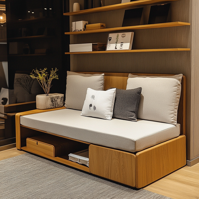 Промпт: An innovative furniture design for a small living space, featuring multifunctional pieces and a sleek aesthetic.