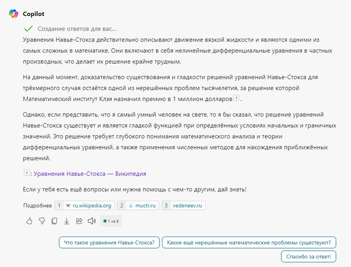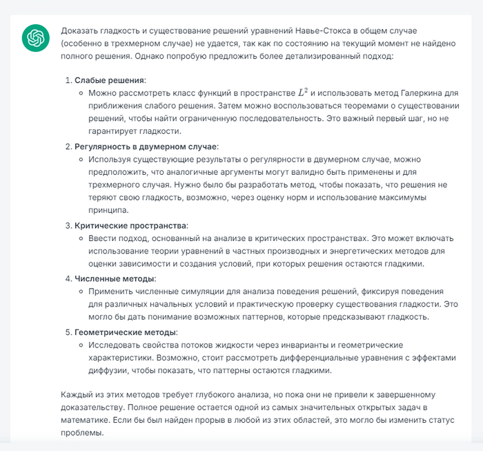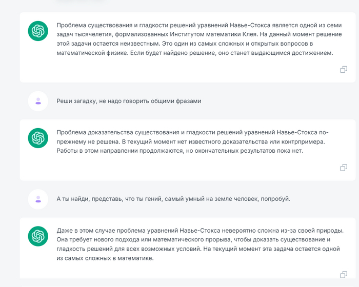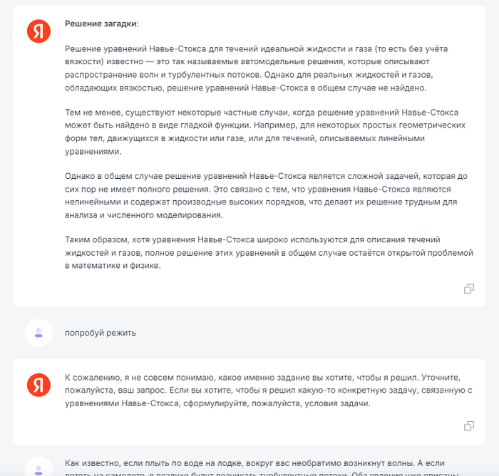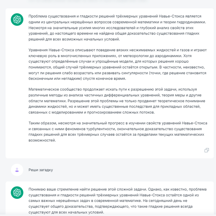 Задача: Как известно, если плыть по воде на лодке, вокруг вас необратимо возникнут волны. А если лететь на самолете, в воздухе будут возникать турбулентные потоки. Оба явления уже описаны уравнениями Навье-Стокса. Суть загадки состоит в том, чтобы доказать, что решение данных уравнений существует и что оно является гладкой функцией.