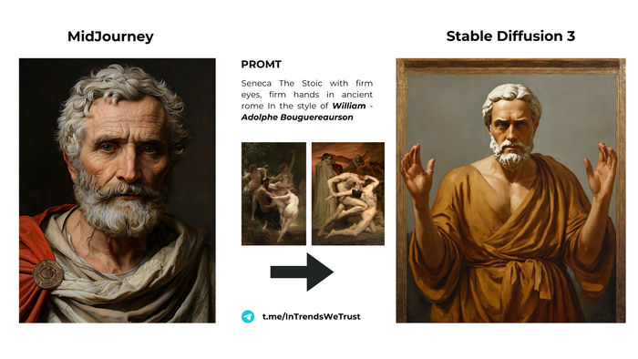 Я попробовал генерации сравнить с MJ, да, разница огромна. Но, что интересно, где-то отдельные детали тот же SD понимает гораздо лучше MJ, например, стилистику картины Вильяма Бугро MJ слажала, так как у нее ближе к фотореализму, в то время как у SD было чуть более точнее.