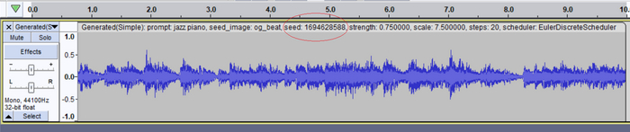 Совет : сгенерированный трек будет помечен свойствами, которые использовались для его создания. Одним из важных свойств, на которое следует обратить внимание, является семя (обведено выше). Если вы хотите снова воссоздать именно этот аудио фрагмент, вам нужно будет использовать это начальное значение.