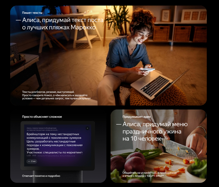 — Алиса — про возможности искусственного интеллекта. Виртуальный ассистент помогает придумывать идеи, писать и редактировать тексты. Общаться с Алисой можно на устройствах и в Чате с Алисой. Всё это работает на базе YandexGPT 3 Pro — самой мощной нейросетевой модели Яндекса.