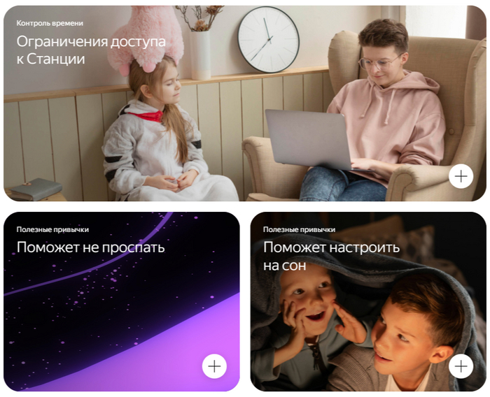 — Алиса — про детей. Детям станет доступен новый формат обучения — познавательные квесты и игры на каждый день. Можно будет настроить расписание, а Алиса будет приглашать ребёнка позаниматься и помогать соблюдать распорядок дня. Также получится настроить ограничения по времени, когда Алиса будет доступна для ребенка. А ещё проверять в приложении, какие видео и музыку смотрели и слушали на Станциях. Также, можно установить ограничение на просмотр видео.