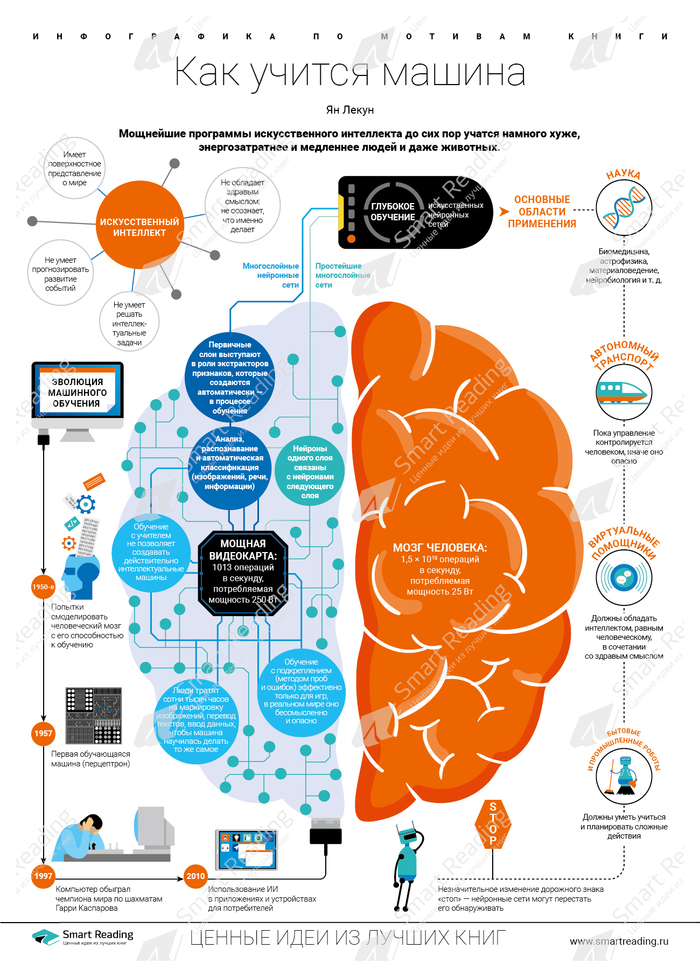 «По уму они уступают кошке, мозг которой содержит 760 млн нейронов и 10 000 млрд синапсов. Не говоря уже о ее «двоюродной сестре» собаке, в мозге которой 2,2 млрд нейронов. Мы не можем проектировать и строить машины, которые по мощности даже приближались бы к человеческому мозгу, с его 86 млрд нейронов и потребляемой мощностью около 25 Вт».