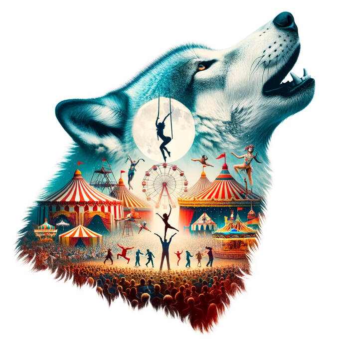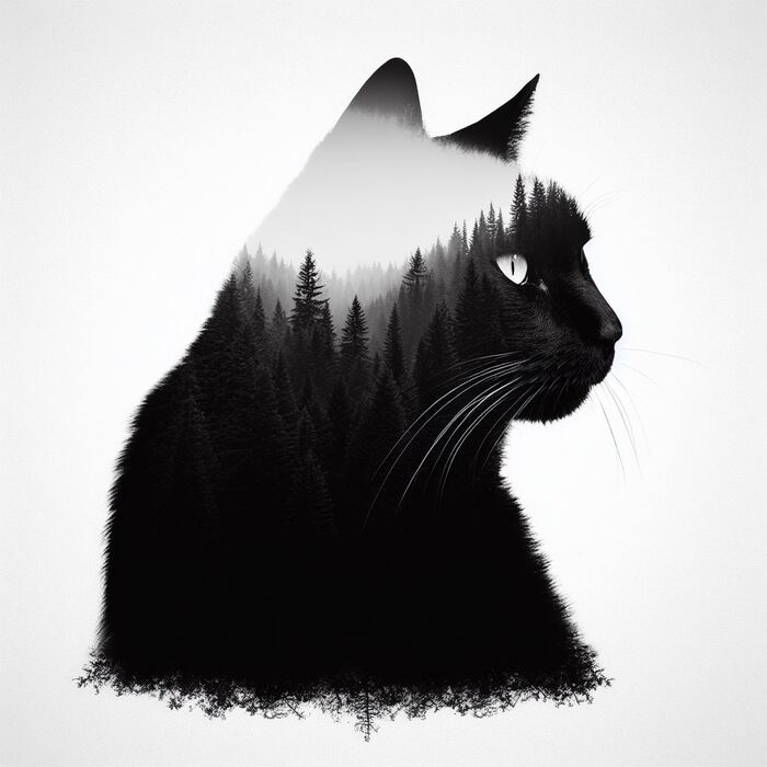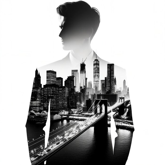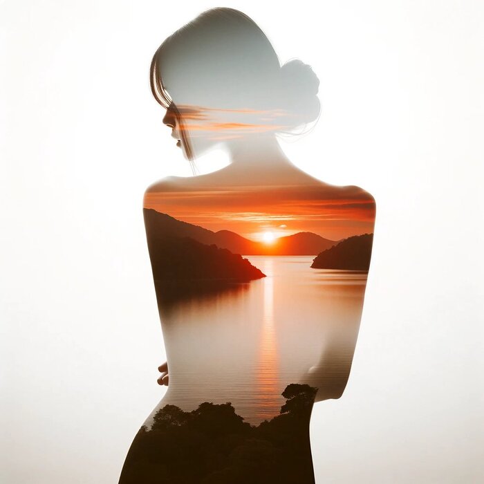 Create a surreal [Color] double exposure photo of a [Subject #1] and a [Subject #2]. The background should be minimalistic and white.