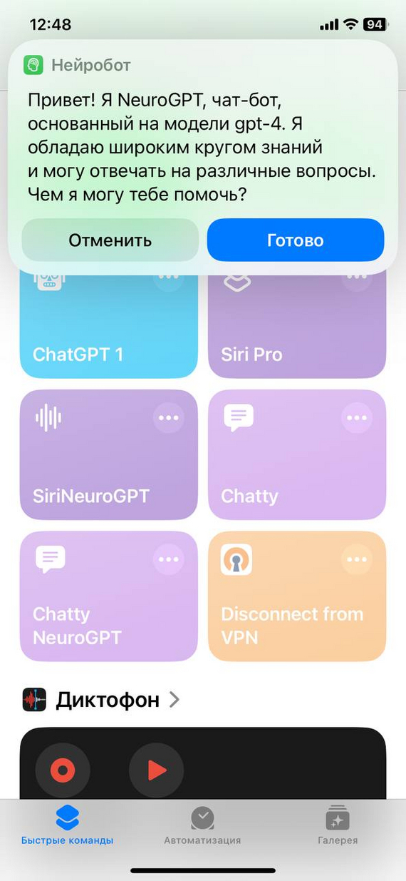 А для iOS мы используем встроенный функционал Команд. Загрузить их можно с iCloud: Версия с GPT-3.5-Turbo (стабильная) / Версия с GPT-4 (нестабильная)