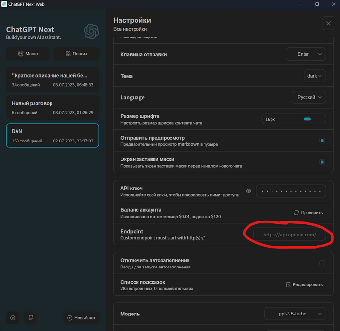 Возьмем программу ChatGPT Next. В настройках у нас есть графа Endpoint, где указан официальный API сервер OpenAI: