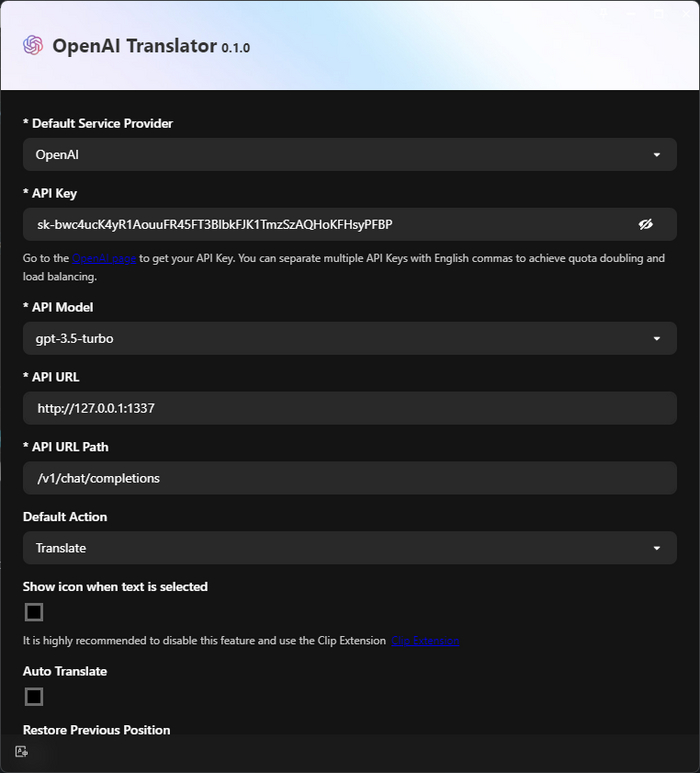 Учтите, что называться он может по-разному: Endpoint, OpenAI API Server, API URL, и т.д. Самое главное, что обычно по умолчанию это идет адрес https://api.openai.com и его нам надо заменить на наш http://127.0.0.1:1337