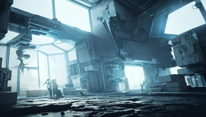 Лично мне особо нравится 2 изображение, вроде бы пустая локация, не полноценный арт будто, но ловлю от него какое-то ощущение покоя и порядка. Подсказка: creative art with the three dimensional objects of the future IT technology, unreal engine, severity, highly detailed, dramatic lighting, sharp focus, octane render, trending on artstation, artstationhd, artstationhq, 4k, 8k