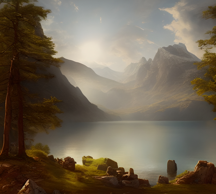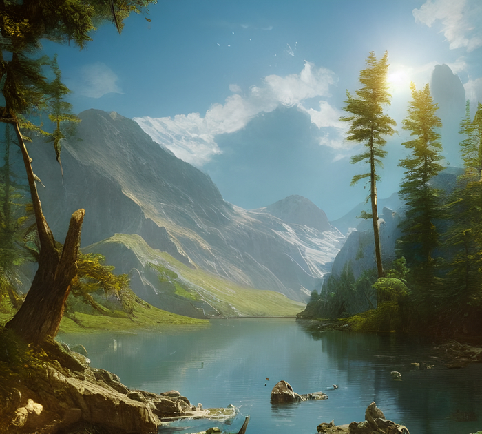 Запрос - Mountain lake, shore, mountains, mountain fells, forest, blue sky, bright sun, concept art, 3d concept, high detail, artistic rendering, shadow lighting, Raphael Lacoste, Albert Bierstadt